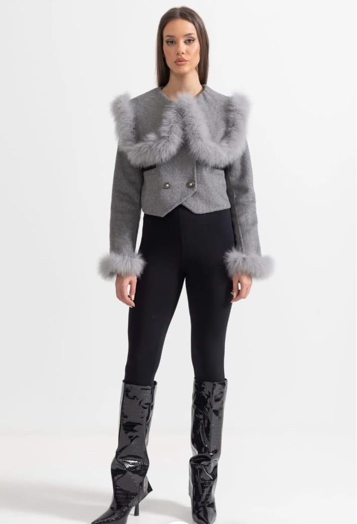 Gray Double Breasted Cropped Jacket With Fur Collar Embellishment