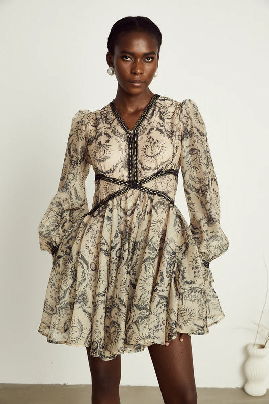 Bow-Neck Pleated Mini Dress with Gold Buttons – Black