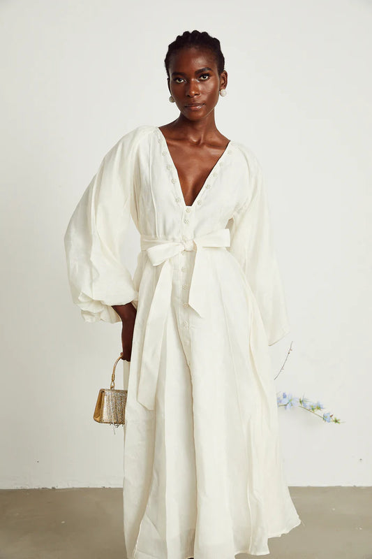 Long Silhouette Dress With Lapels And Crystal Detailing - White