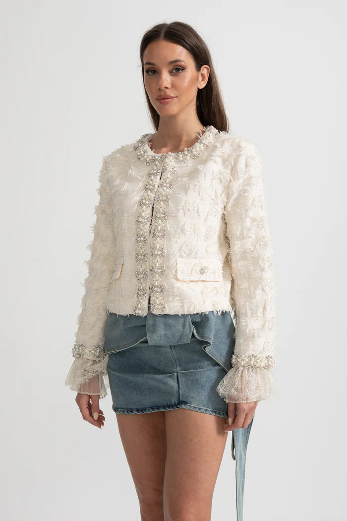 voire Textured Jacket Top with Pearl and Crystal Embellishments