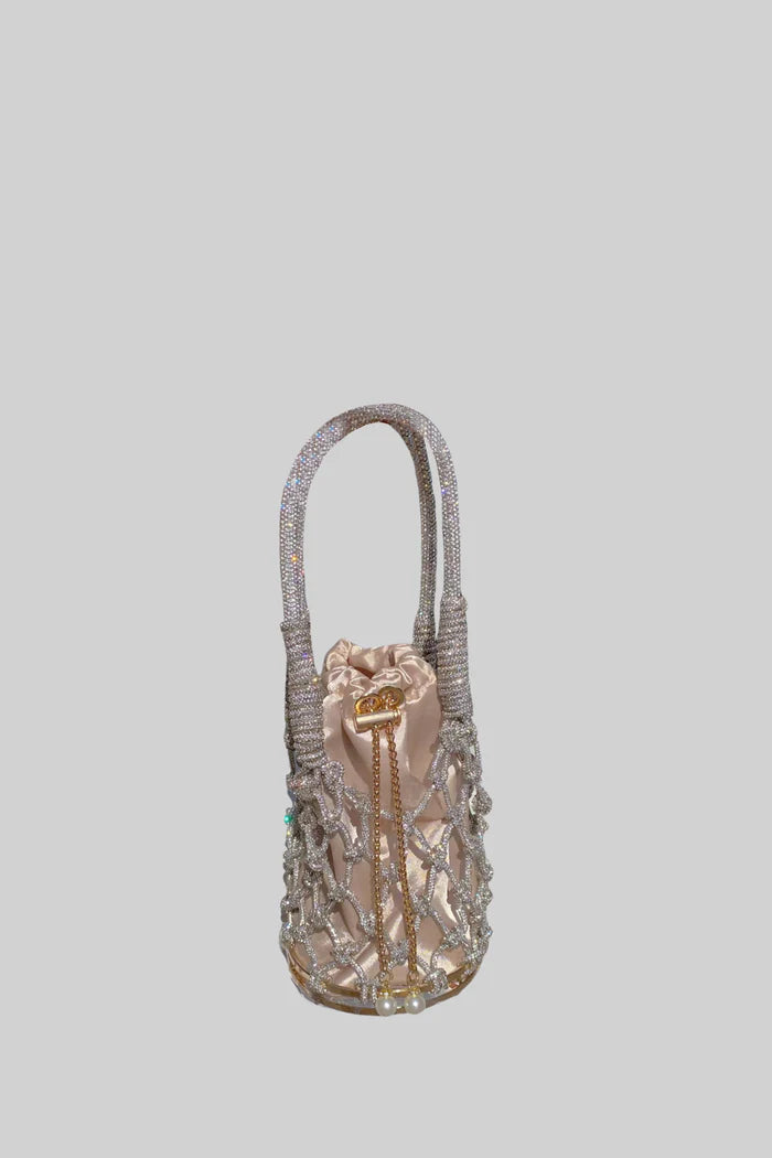 Runde Netzhandtasche mit Beige Satin Draw String Beutel - Silber