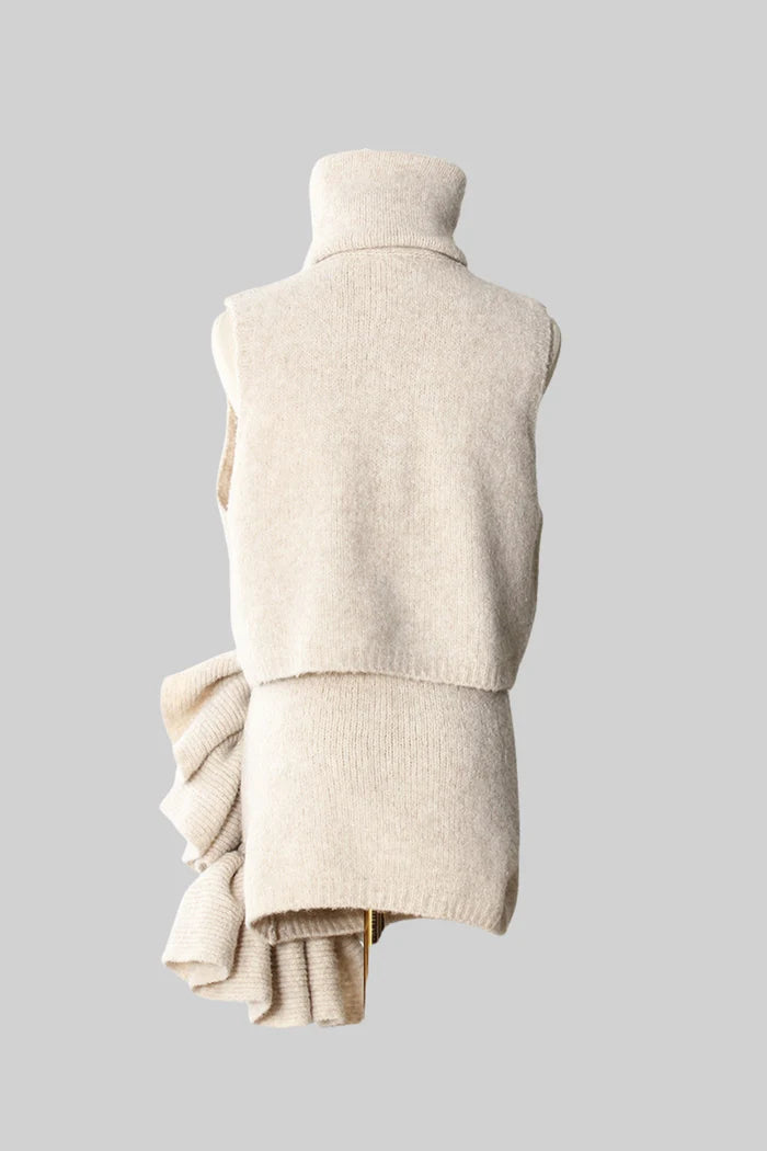 Beige Knitted Three-Piece Set with Sculptural Ruffle Details