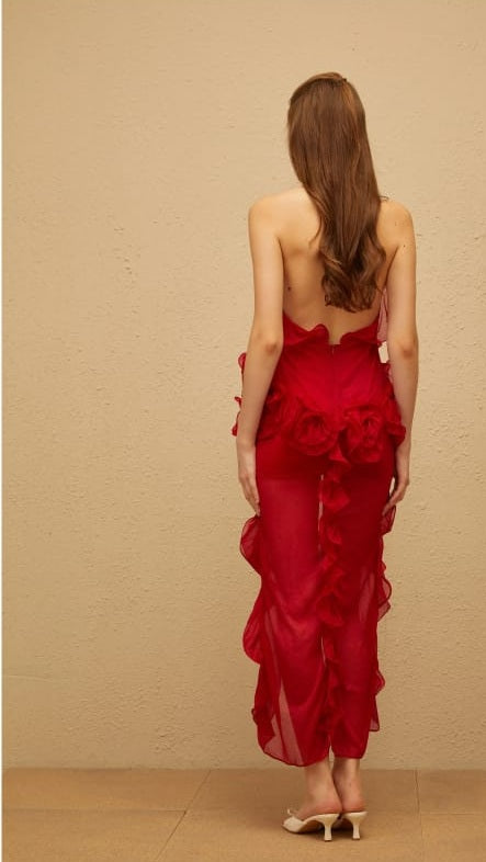Hannabella Red Asymmetrical Ruffled Floral Mini Dress