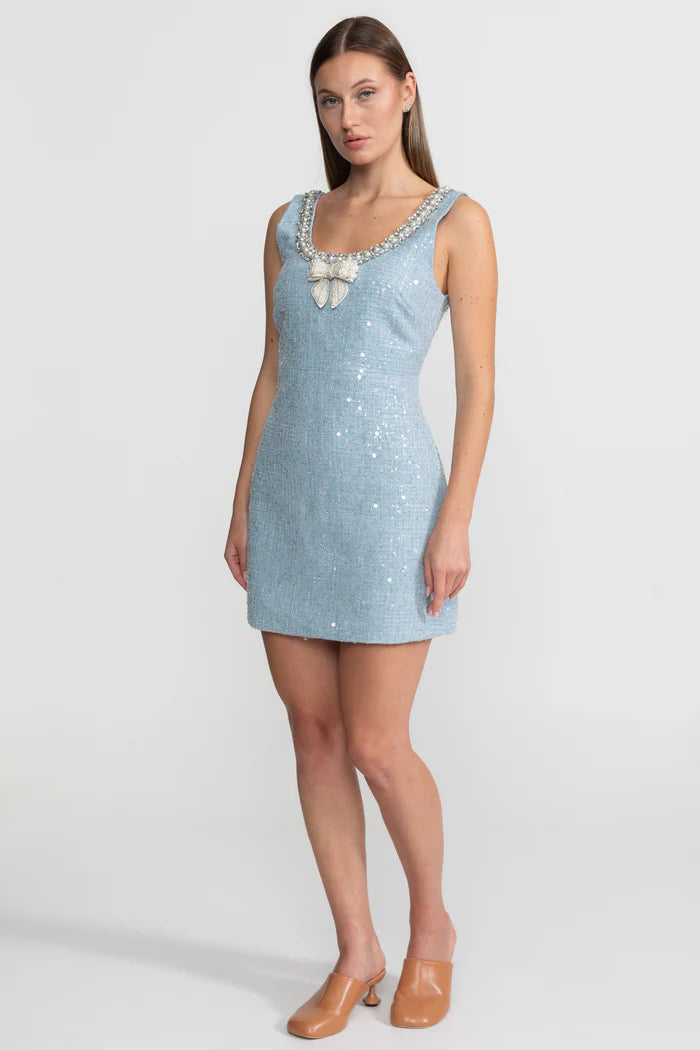 Embellished Tweed Mini Dress With Pearl Bow – Sky Blue