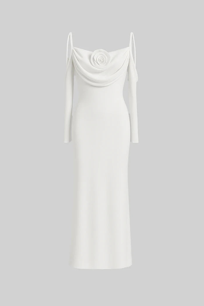 White Elegant Flowing Dress With Long Sleeves, Top Draping And Central Rose Adornment