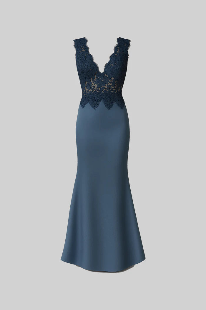 Teal Elegant Sleeveless Evening Gown With Fitted Silhouette, Lace Detailing And Satin Skirt