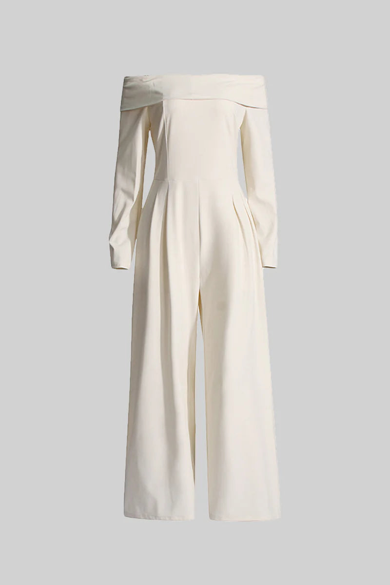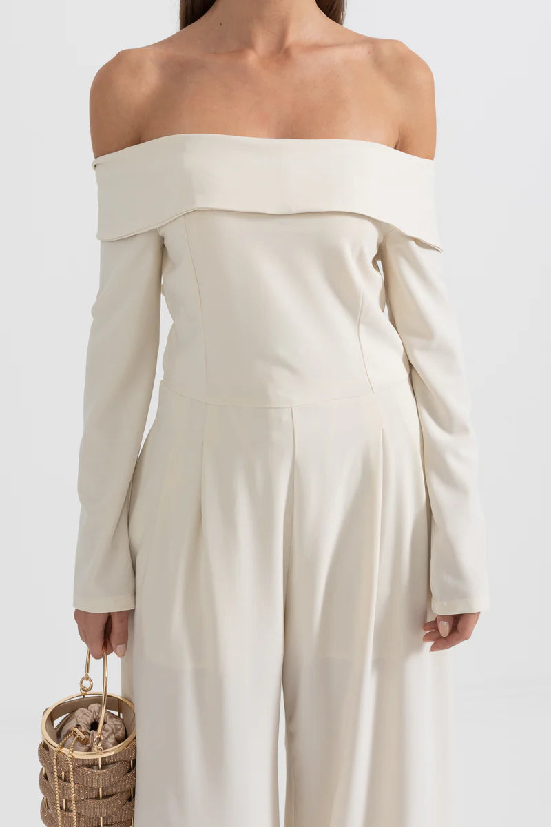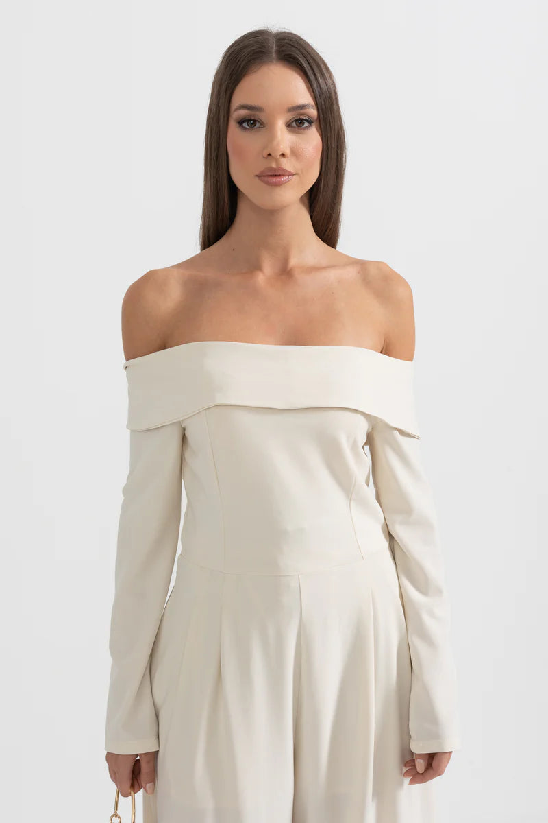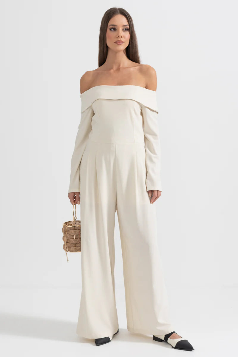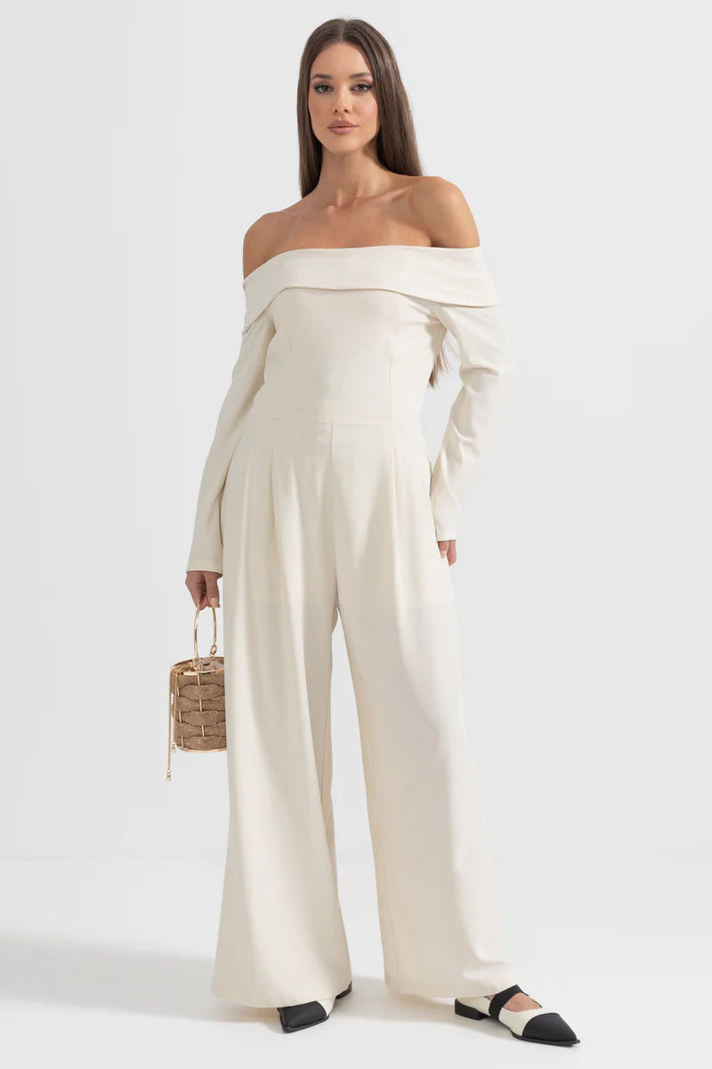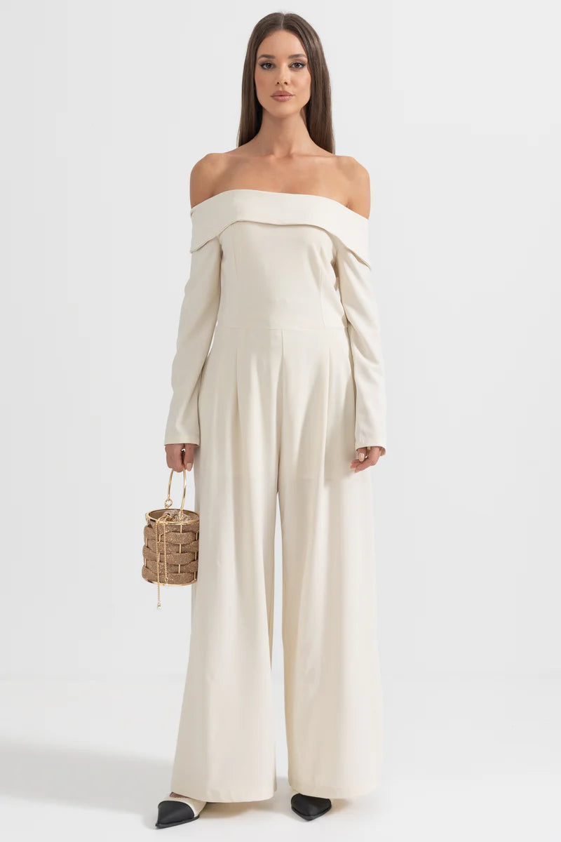 Beige Off-The-Shoulder Jumpsuit With Back Bow Detail