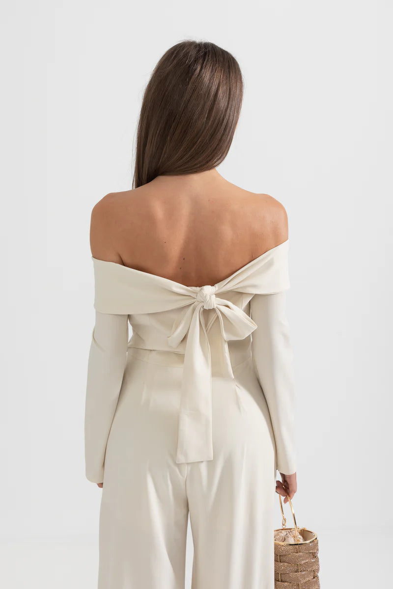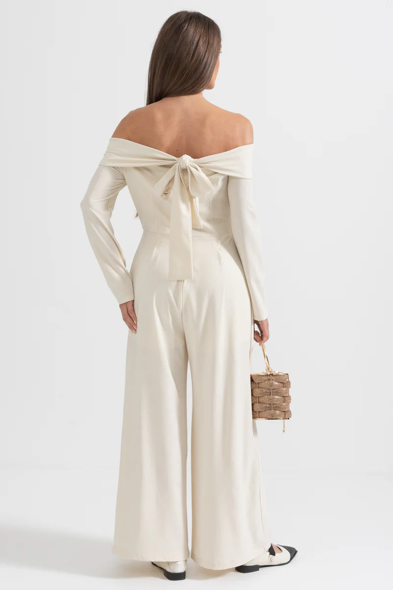 Off-The-Shoulder Jumpsuit With Back Bow Detail - Beige