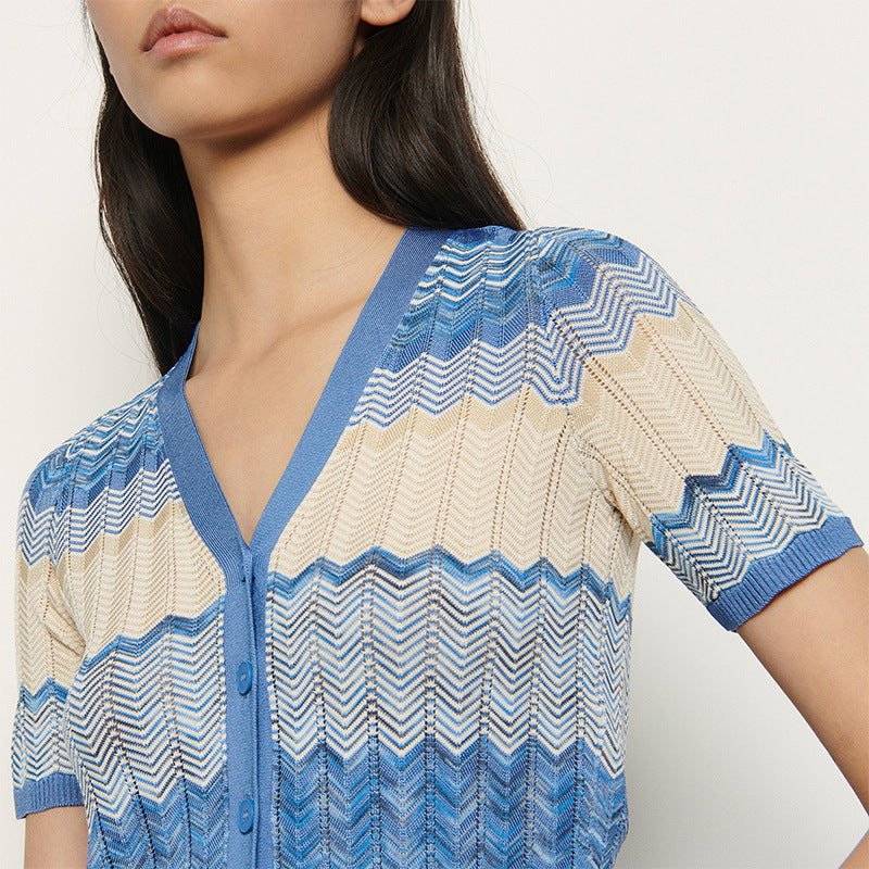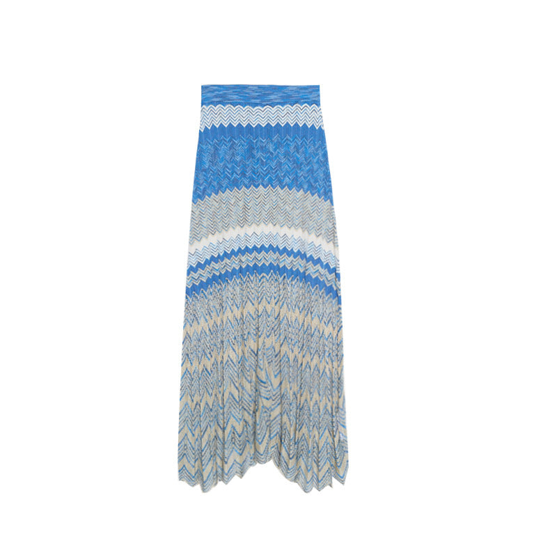 Spring summer V-neck stitched striped knit sweater women's pleated skirt suit goddess fan two-piece set