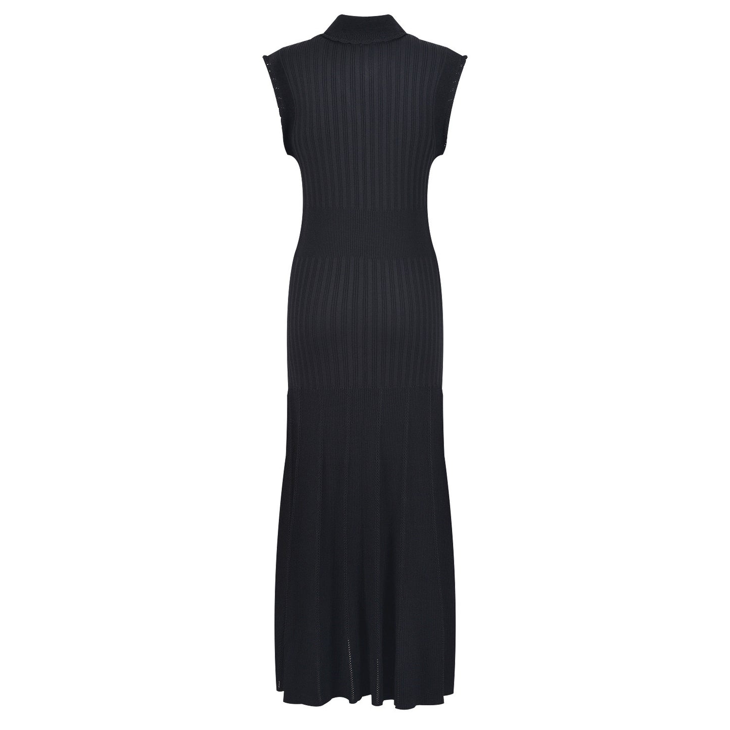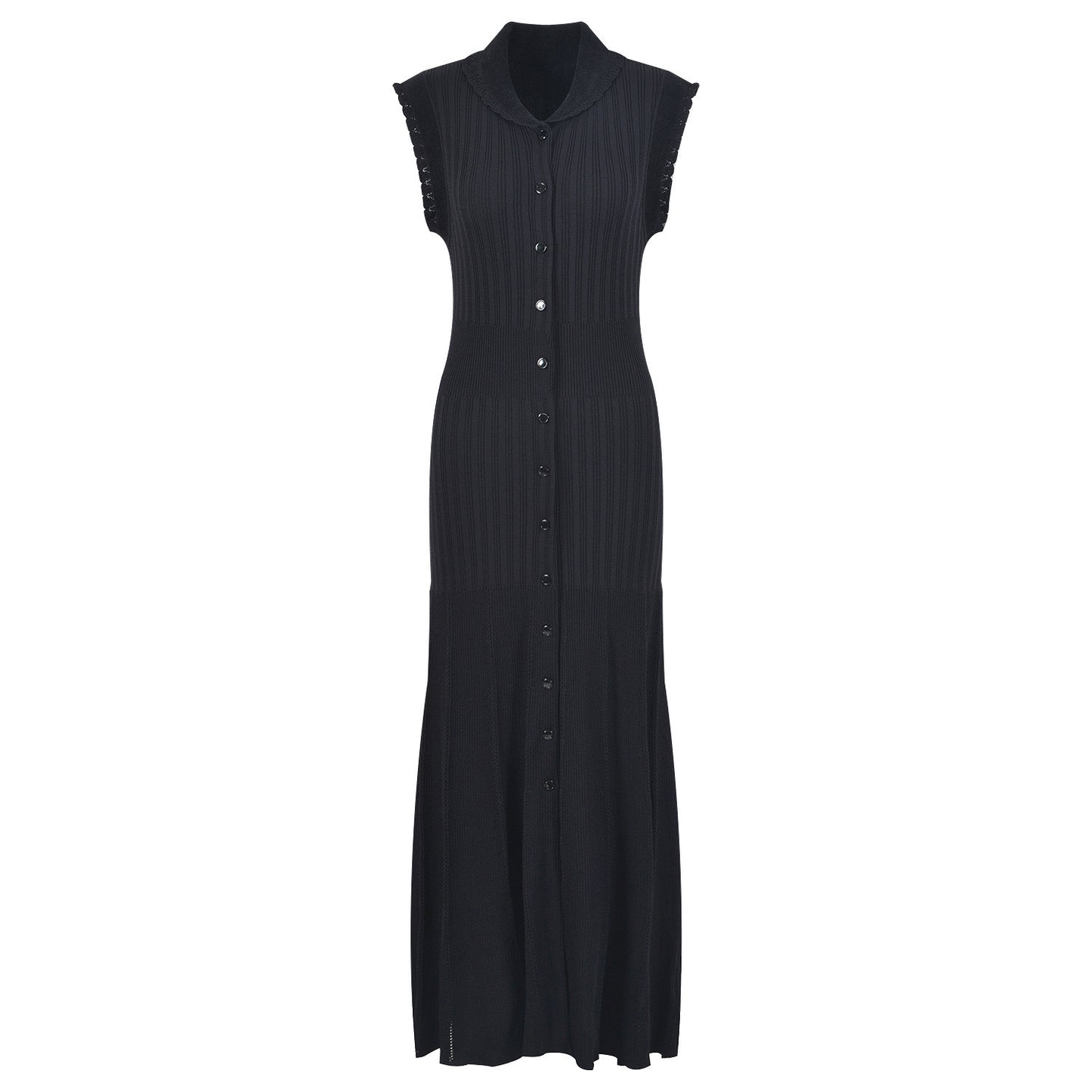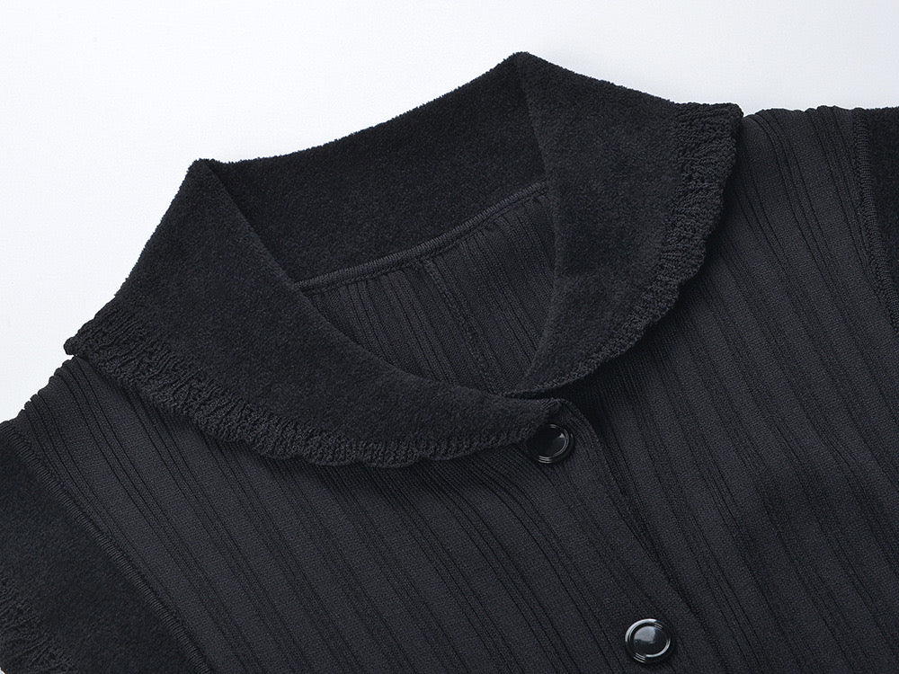 Black, knitted material, tuxedo collar, button closure at the front, ruffle details, sleeveless and midi length.