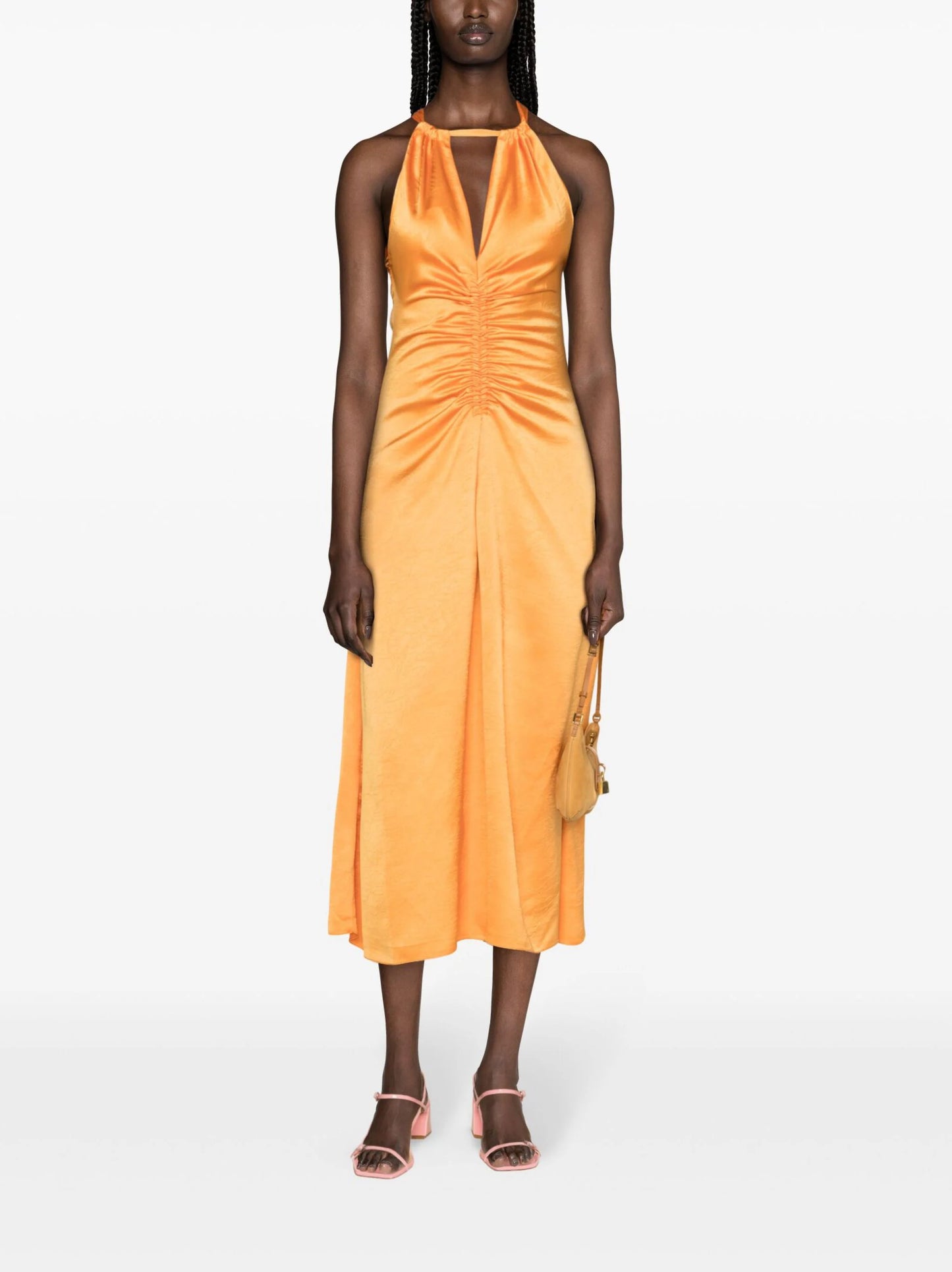 This satin midi dress captures a playful side of Sandro with its luminous bright-orange hue. A drawstring halterneck allows subtle alteration, while the ruched front introduces a tactile dimension.